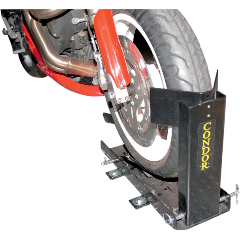 CONDOR Trailer Chock Stand SC-2000As a trailer chock it easily snaps on and off all transport platforms; attaching and detaching the unit takes only a few seconds, Patented locking mechanism effortlessly and securely supports motorcycle in an upright posit