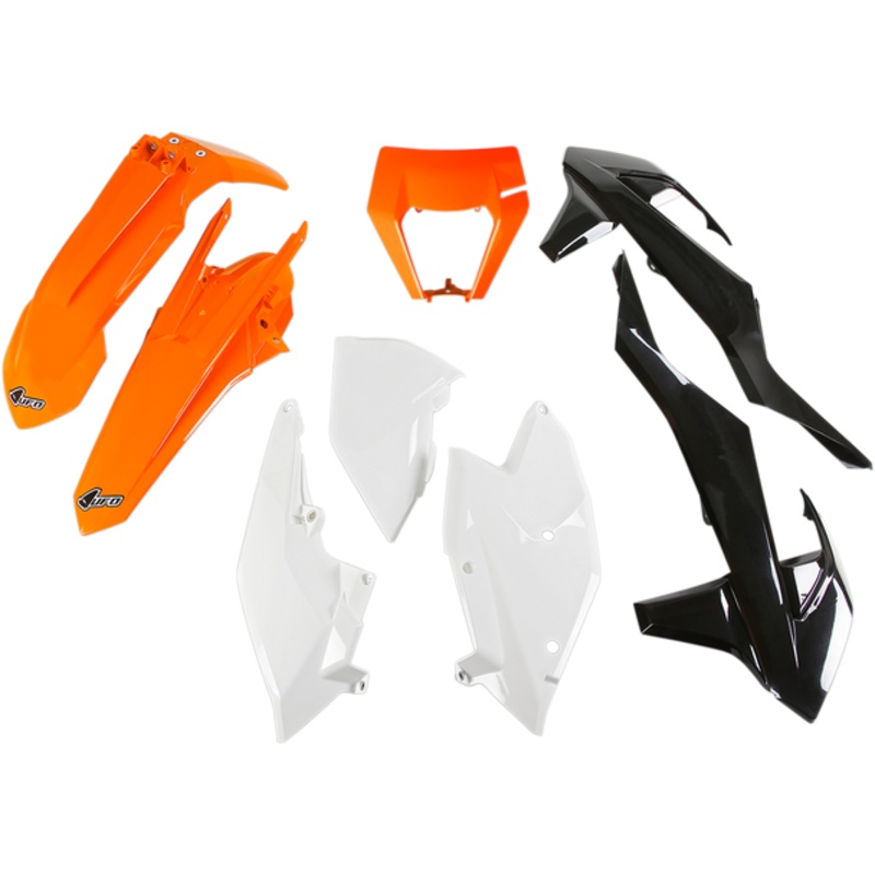 UFO Replacement Body Kit OEM Orange/White/Black EXC KTKIT523999WPre-drilled pieces mount easily to stock locations, Body kit includes front and rear fender, radiator covers, side panels and front number plate; OEM matches stock bike color, Easy bolt-on ins