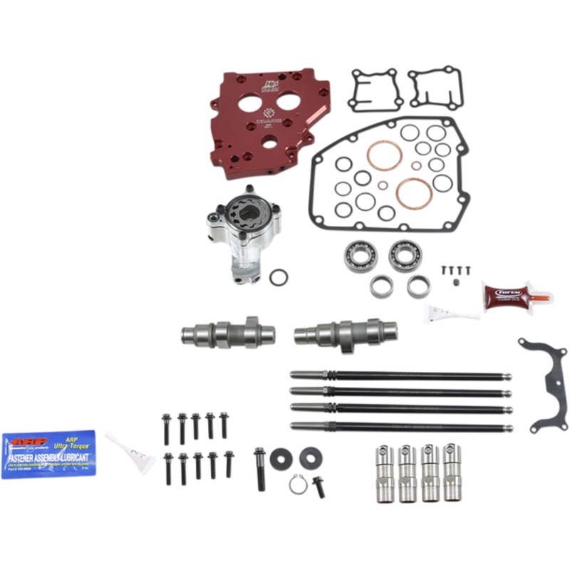 All necessary components from top-to-bottom of the camchest, Provide maximum reliability, longevity, peak performance, and the coolest engine and oil temperatures obtainable, Quieter and smoother engine operation, Increase oil pressure, scavenge volume and engine oil flow, 25-35 degree cooler engine temperatures, 15-30 degree cooler oil temperatures, 15-30 more PSI of oil pressure, Eliminate wet sumping, blow by and oily air cleaners, Heavy-duty Fast Install adjustable pushrods can be installed without removing top rocker covers, Includes Feuling HP+ high-volume oil pump, high-flow billet cam plate, REAPER Series camshafts, HP+ hydraulic roller lifters, Fast Install adjustable pushrods, Timken/Koyo bearings, gaskets, O-rings, hardware, ARP fasteners, washers, moly lube and Loctite, Conversion chain drive kits update early mechanical-style tensioner systems to the new late-style hydraulic tensioner chain drive system; these kits utilize conversion Reaper camshafts which have ’99-’06 inner-cam journals matched with ’07-’17 outer-cam journals, allowing the use of the ’07-’17 cam plate and hydraulic chain drive tensioner system; hydraulic chain drive components purchased separately, Installation of gear drive cams will require separate purchase of SS or Andrews 4-gear drive kit