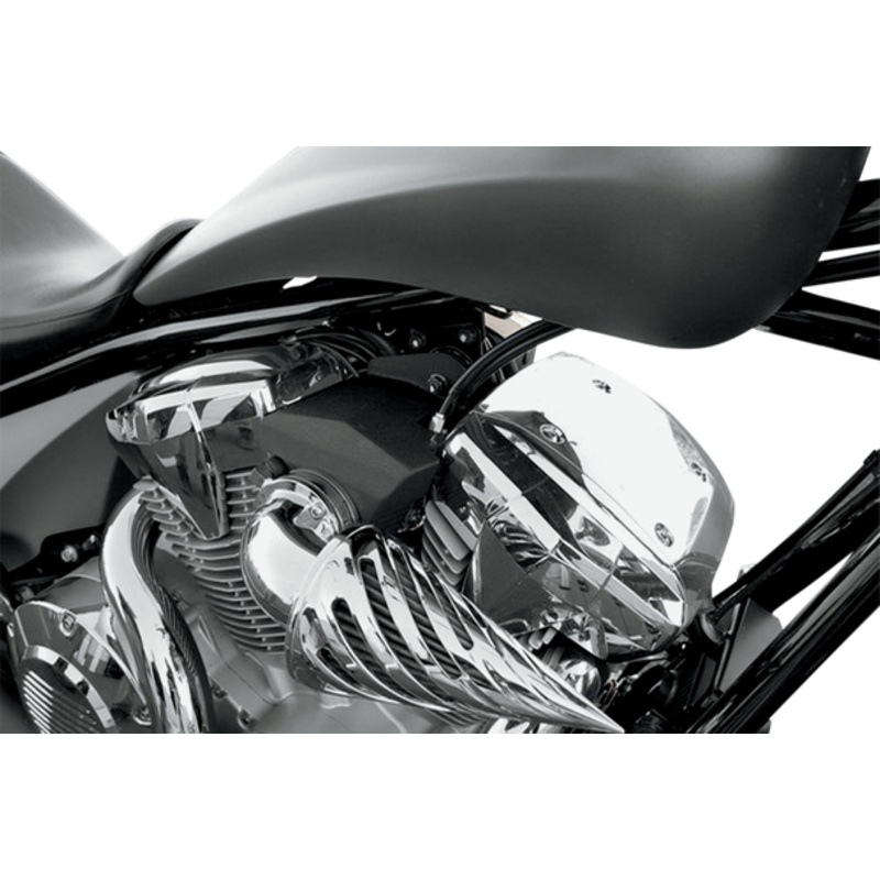 Hides throttle body when installing aftermarket air filter, Black powder-coat wrinkle finish, Water-jet cut from steel, Made in the U.S.A.