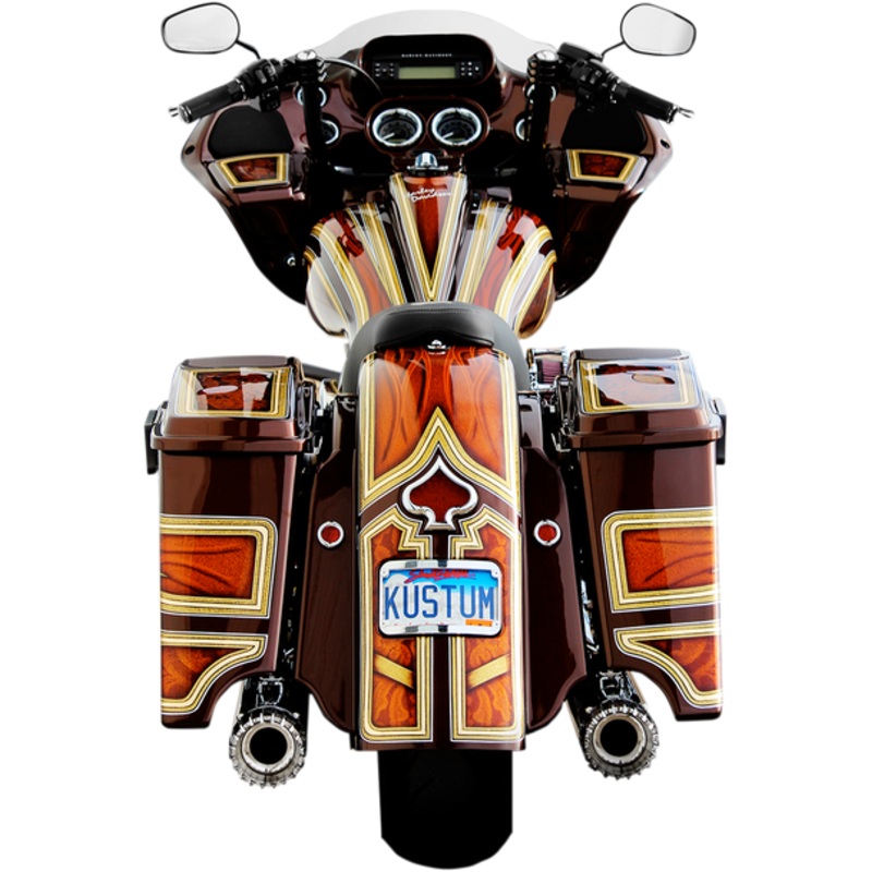 Frenched with a frenched license plate pocket, An all steel option for those Bagger owners that want that seamless one piece rear end look, Stamped 14-gauge steel construction with integrated bag-to-fender filler panels, The same deep draw stamping quality as the rest of the Klock Werks sheet metal line, Filler panels are 100% TIG welded to fender, Filler panels mate up to rear top strut covers perfectly, Dual exhaust cut out in the bottom of the filler mate up to extended bag and bag extensions offered in the aftermarket, 8.625 wide with 4 stretch, Look equally as good without extended bag, Accept all stock detachable mounting hardware/brackets, Made in the U.S.A., For use with Klock Werks The One Rear Fender Lighted License Frame – see Related Products