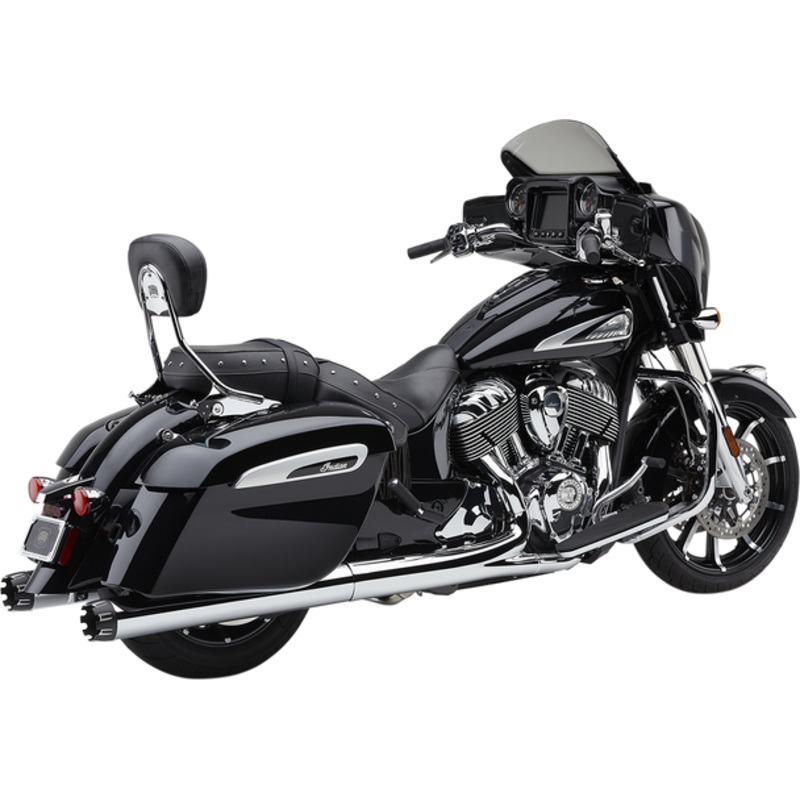COBRA Dual Cut Muffler Indian Chrome 5206Uses a 4-inch body capped off with beautifully machined aluminum tips. These tips feature dual cuts finished with machined alluvial flutes. END CAP MATERIAL:
