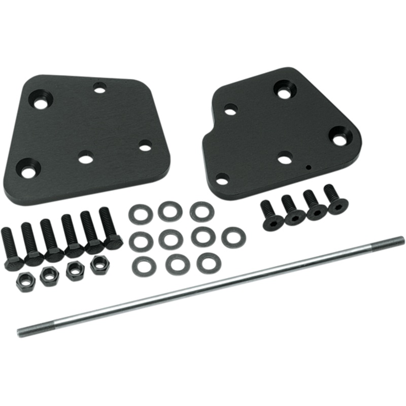 Moves floorboards, shifter and brake forward 2″, Utilizes stock floorboards, shift lever, shifter arm and brake arm, Black powder-coated aluminum extension plates, stainless steel extended shift rod and necessary mounting hardware included, Made in the U.S.A., Extended rear brake line must be purchased separately, Will not work with engine guards, except on FLSTF or highway bars; designed for use with stock fenders, brake pedals and shift levers, Installation of this kit may cause interference between front fender and floorboards. Check clearance of fender and floorboards with front fork compressed and extended.