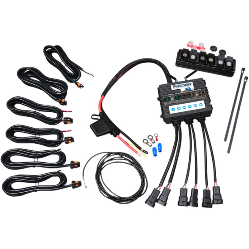 Control box:, 6 channels, 2 x 30 amp circuits, 2 x 10 amp circuits, 2 x 5 amp circuits, All Solid State, 12-24 volt, RF Remote switch pad usable inside or outside the vehicle, Bluetooth control from phone/tablet app, Manual buttons for on/off on top of case, DIN connector built in for manual control with conventional toggle switches (harness sold separately), Low voltage cutout to shut down Trigger if battery voltage gets low, 100 amp fuse installed on positive input wire for protection, 12 to 24 volt out with waterproof connectors, Fuses built in, waterproof cover (30 amp – 1 and 2, 10 amp – 3 and 4, 5 amp – 5 and 6), LEDs to indicate relay on and if fuse is blown, blue for circuit on, red for blown fuse, Waterproof case design, withstands temps to 250 deg. F and -20 deg. F below freezing, 12 to 24 volt input, 3 wires, ground, switched positive, battery positive, RF Remote:, 2.4 ghz frequency hopping RF connection to control box, Replaceable battery power and/or 12 volt hardwired option for backlit switches, Back lit with press of button, delayed off for the back light. If hardwired, provides a color changing option adjustable from App, Back lights stay lit when vehicle lights are on, Custom switch labels included, Weatherproof design, App Control:, Apps for both Android and iOS with simple interface for turning on and off the 6 channels, Allows customized names for each channel, Battery voltage shows in App screen
