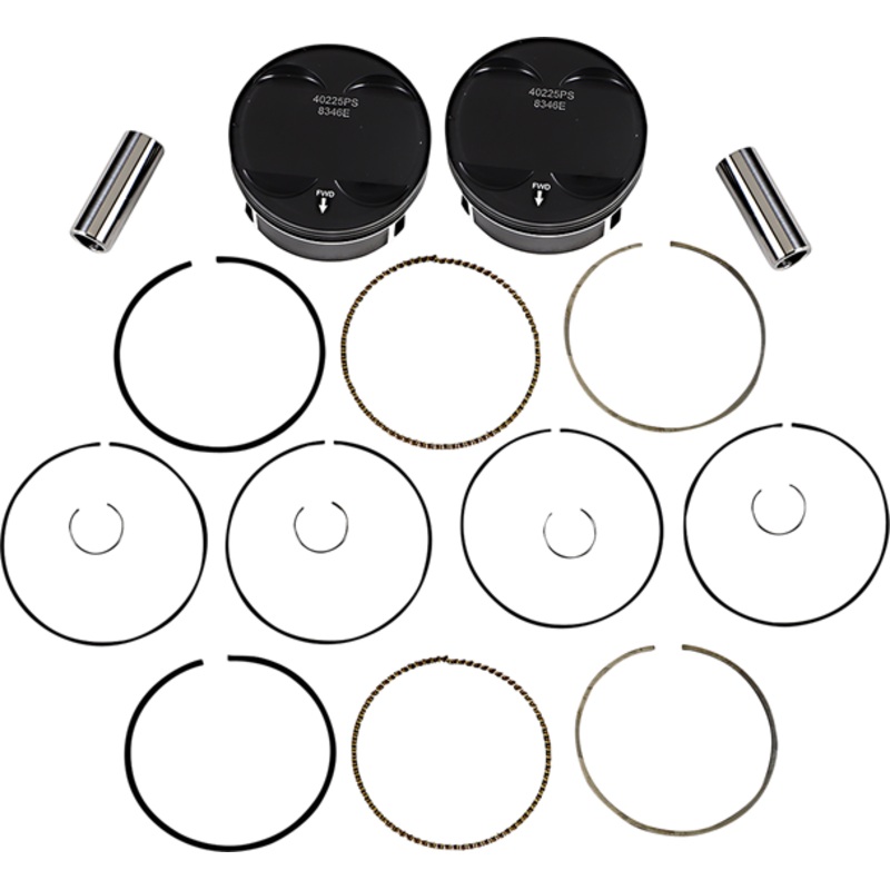 Feature ArmorX piston coating for superior protection in extreme conditions and reduced wear, ArmorFit skirt coating auto-adjusts to the cylinder wall so theres no need to measure clearance; provides smooth, quiet, trouble-free operation, Dome design for improved flame travel to maximize air/ fuel burn efficiency, High compression (11:1) for added power, Superfinish piston pin reduces friction and improves scuff resistance, Enhanced pin oiling for improved lubrication and reduced friction, Augmented ring land details improve ring seal and function, Dedicated rings for precise fit, improved compression and oil control, Fit OEM and Screamin Eagle cylinder heads, Kit includes two pistons, rings, piston pins and circlips, Made in the U.S.A