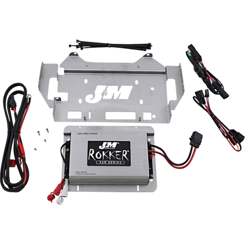 This is a full range class D audio amplifier and is specd at 200watts RMS per channel X2 channels, (400w total) driven continuous into a 2 ohm load @ 14.4vdc., The ROKKER XXR amplifier’s settings have been dialed in optimized for this exact speaker configuration, to provide the on-highway volume, clarity and overall performance that most riders only dream about., Amplifier mounts to the custom made stainless steel bracket system, to provide solid and secure mounting inside the Harley batwing fairing., Custom made plug-n-play wiring harnesses are included with this amplifier kit, top quality heavy gauge power/ground wires are used for the fused battery connection, along with all necessary mounting hardware complete installation/operation instructions., Amplifier measures 7-1/4 X 4-3/4 X 1-3/4