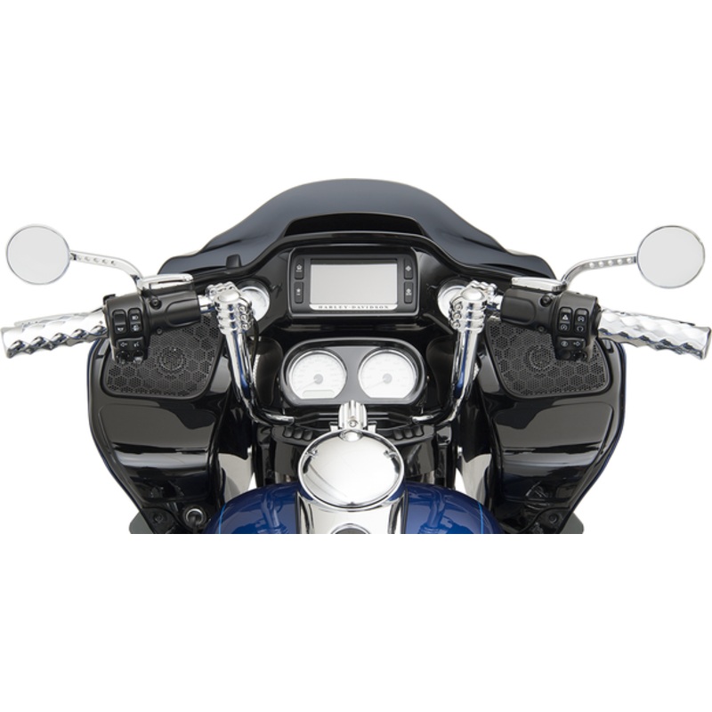 Innovative bars present the ultimate in rider personal adjustment and fit, Offer more pullback than the standard Klip Hanger bars for a more relaxed ride, Unique “Klamps” allow control/grip portions of the handlebar to be adjusted in several directions; rider can tailor to his/her exact liking, Bar sections are manufactured from DOM tubing, ‘Klamps’ are machined from 6061 billet aluminum, all hardware is stainless steel, All feature a fully knurled riser clamp area for standard 5-1/4″ width 1 risers, All are drilled/slotted for wiring and bar end is notched for Throttle-By-Wire applications, All include chromed, billet aluminum, domed bar end plugs for a finished look, Works with HD OEM Heated Grips, Made in the U.S.A.