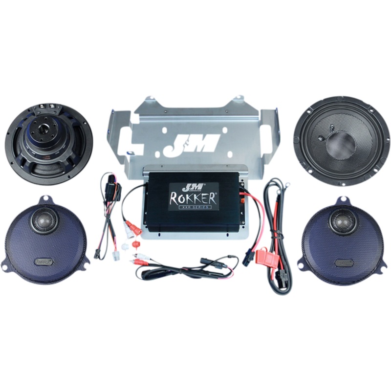 J M 400w 2-Speaker/Amplifier Street Glide/Ultra XXRK-400SP214SGKit includes a full range class D audio amplifier, spec'd at 200watts RMS per channel X2, (400w total) into 2-ohm load @ 14.4vdc with dimensions of 7 " X 4 " X 1 ", Amplifier mounts to custom m