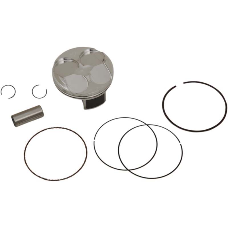 All pistons are heat treated with a T-5 hardening and tempering cycle, All piston skirts are coated with a high-tech Molybdenum Disulphite coating for faster break-in time and increased piston life, Cast piston kits are gravity cast aluminum alloy (not forged) with 18% silicone content, which produces an extremely light but very strong piston, Forged pistons are forged from 2618 aluminum for superior strength and durability, Forged High Compression pistons improve power and torque across entire rpm range, Big Bore pistons increase engines displacement, torque, and peak horsepower, Forged Replica pistons are forged OE replacements, Replica pistons and all rings are OEM replacements, Kit include piston, rings, wrist pin and circlips, Replacement two-stroke piston rings sold individually; four-stroke piston rings sold as a set as needed, Top End Kits include Piston Kit and a Top End Gasket Kit, top-end bearing and cam chain.-