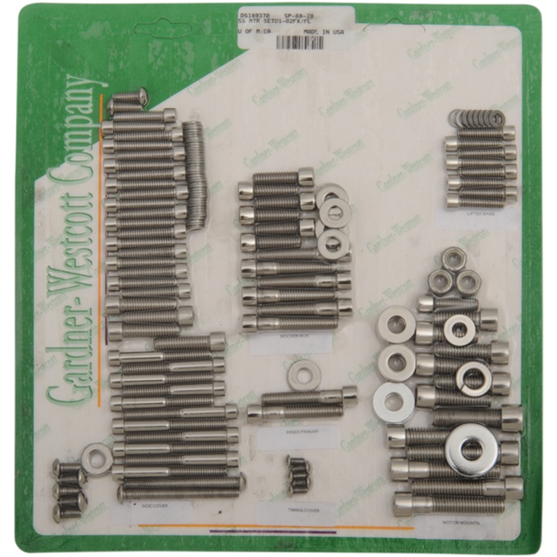 GARDNER-WESTCOTT Stainless Steel Motor Set SP-88-79Motor sets include cam cover, primary cover, transmission side cover, oil hose cover, lifter base, rocker box, front inner primary, washer, motor and transmission mount bolts, Side cover sets include cam,