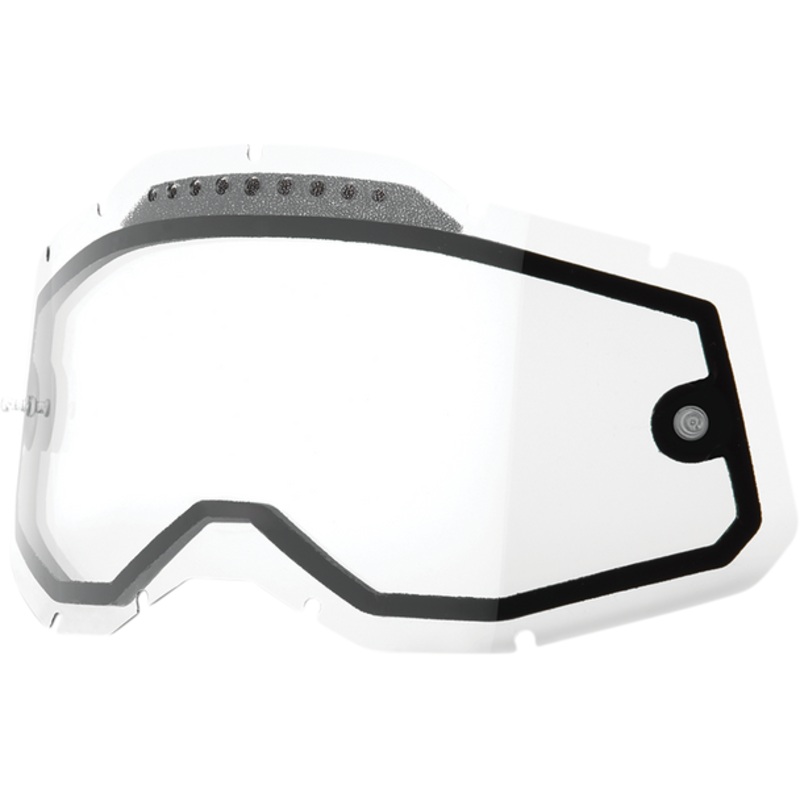 100% Accuri 2/Racecraft 2/Strata 2 Dual Lens Vented Clear 59082-00001Double layer lens with anti-fog coating, Safeguards against UVA and UVB spectrums up to 400nm DISPLAY LENS COLOR/FINISH: