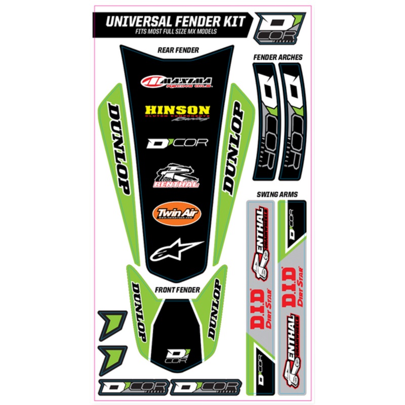 D'COR VISUALS Universal Trim Kit Green 15-20-100Fits most MX full size models, Includes graphics for front fender, rear fender, fender arches and swingarm, 15 mil decal thickness COLOR/FINISH: