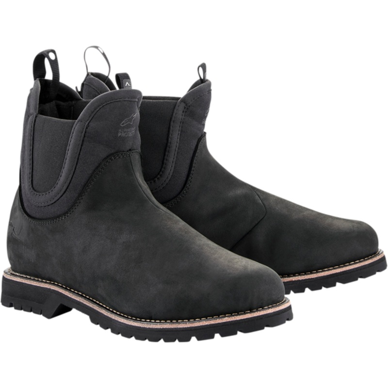The Turnstone Shoe is engineered with an innovative retention system to keep the shoe securely in place with a customized fit, and this is achieved via an innovative internal hidden lace system that the user can adjust and tighten properly by activating the adjustable tab on the back of the shoe, The Turnstone is a protective shoe; the protective ankle discs are integrated into the elastic side and the lateral and medial side have been engineered in different heights in order to better cover the malleolus, A dual density ankle medial and external cup protects the malleolus area against impact, with a reinforced heel counter and toe box for additional strength, The classic elasticated entrance is easy to use and promotes comfort in any situation, High quality bovine leather, Innovative hidden retention system, Alpinestars ride and walk comfort