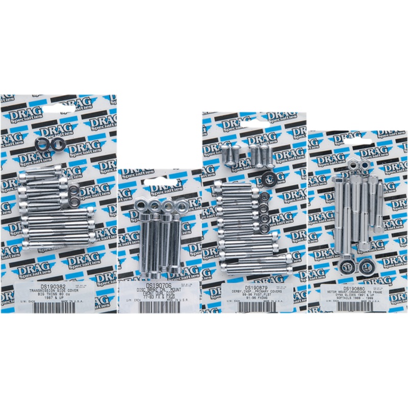 Socket-head bolt sets to meet virtually any custom need, Complete motor sets for 07 and later Big Twin include bolts for primary, cam, cam sensor, derby, rocker box, transmission top, transmission side, lifter block and clutch covers, Complete motor sets for 87-94 Big Twin include bolts for cam, primary, point, clutch, inspection and chain covers, lifter base, inner primary, top front and rear motor mounts, timing plug and header mount screws, Complete motor sets for 04 and later XL include bolts for primary, cam, derby, lifter block, points cover, rocker box and engine case, Complete motor sets for 86-03 XL include bolts for cam, primary, generator, sprocket, rocker box, top motor mount, lifter base, point or magneto cover, Made in the U.S.A.