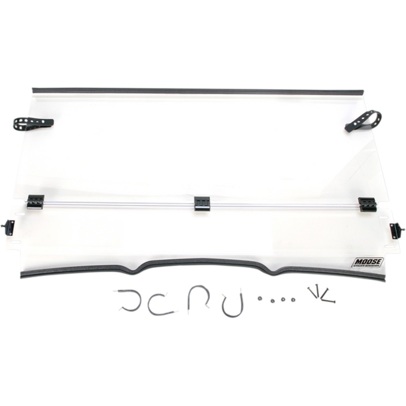 MOOSE UTILITY Full Folding Windshield Teryx LEMA100-0010Made from premium .177" thick polycarbonate shield, Centrally hinged for ventilation, Tool-less operation, Mounts to the roll bar using stainless steel rubber coated mount straps, Windshields feature