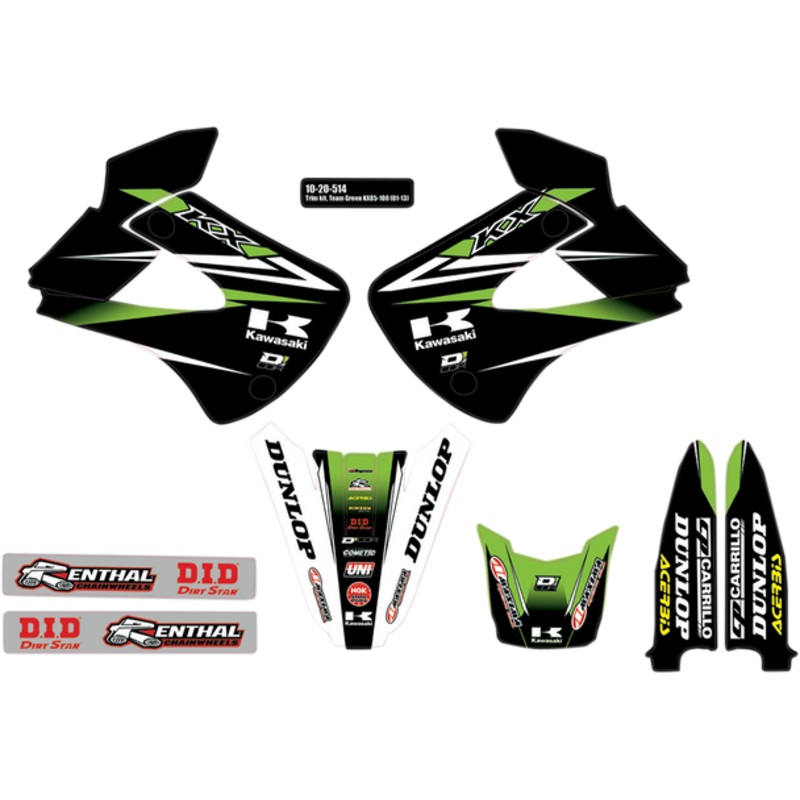 D'COR VISUALS Graphics and Trim Kit Team Green Kawasaki 10-20-514Includes graphics kit for radiator shroud, lower forks, swingarm, front and rear fender COLOR/FINISH: