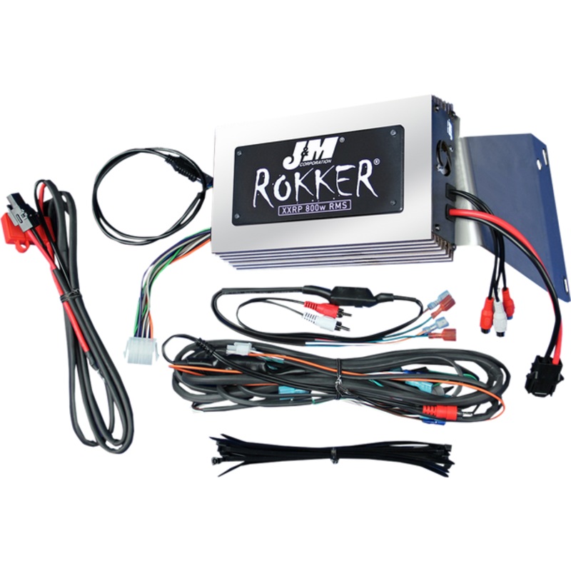 Application-specific amplifier kit, Plug-n-play RCA input harnesses included take the 2-channels of audio signal available from the source and provide 4 separate channels at 800 watts, 2 or 4-ohm speaker load (Manually selectable on the amplifier itself for a 2-ohm or 4-ohm speaker load), Full range class D digital amplifier properly shielded against RF interference into the AM or FM stereo radio bands, Advanced digital switching power supply technology to dramatically reduce the 12v current demands on the motorcycle electrical system, Amplifier mounts to the custom made stainless steel 2-piece bracket system, to provide solid and secure mounting blocking amplifier heat from being transferred to the radio, Fully programmable thru the internal digital signal processor (DSP) and comes out of the box already dialed in for your specific application to provide maximum highway performance from your factory audio system, Also included: custom made heavy-gauge power and ground wires used for the fused battery frame connections, all necessary mounting hardware, complete installation/operation instructions