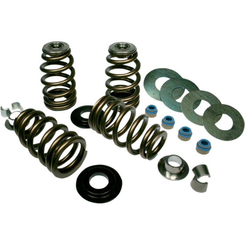 Made from premium stress-relieved conical ovate wire with nitrided surface heat treatment, shot-peened surface enhancements and Nano Peen polish, Feature extremely high level of fatigue life, Use a much smaller and lighter weight retainer to reduce valve weight and create quicker rev and smoother motion, Designed to handle the highest demands of performance engines with high-lift, steep-ramped camshafts, Kits include: High-Load BeeHive valve springs, lightweight 10 Titanium retainers manufactured from Ti-17 alloy and micropolished for enhanced fatigue life, machined heat-treated chromoly spring seats, seat shims, valve locks and a set of premium Viton valve seals equipped with spring-loaded valve stem wiper system, Seat lbs./installed height; 217 lbs. at 1.789″ (.574″ lift), 215 lbs. at 1.800″ (.585″ lift), 208 lbs. at 1.819″ (.604″ lift), 200 lbs. at 1.845″ (.630″ lift), 185 lbs. at 1.900″ (.685″ lift), 170 lbs. at 1.935″ (.720″ lift), 415 lbs. at 1.215″ (open height) coil bind at 1.125″, Dyno proven and track tested, Feuling BeeHive valve springs must be installed at the correct OPEN HEIGHT, matching max lift to the open height spec of the valve springs, Made in the U.S.A., Feuling BeeHive valve spring kits are direct replacement with no machining or rocker box clearance required up to .574″ lift for 84-04 Big Twin and 86-03 XL and up to .700″ lift for 05-17 Twin Cam. Larger camshafts require valve guide machining for seal-to-retainer clearance.