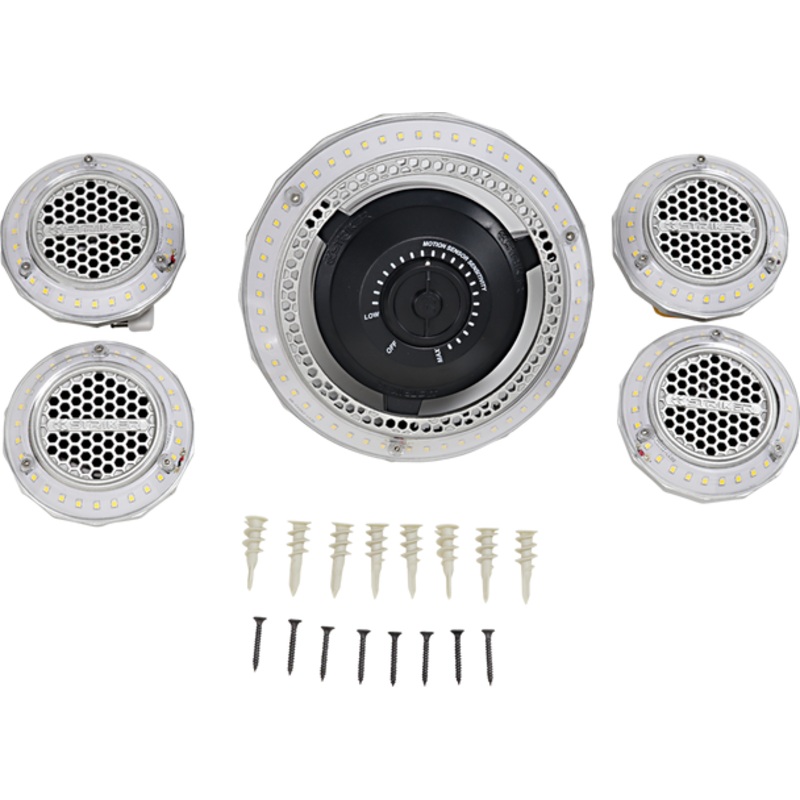 RISK RACING MPI Light System 00194Kit includes 1 hub, 4 pods, 4 ceiling plates, 8 wood screws, 8 self-drilling drywall anchors, and an instruction sheet, Motion sensor features an off mode and different modes for minimum to maximum sensitivity, 360 adjusta
