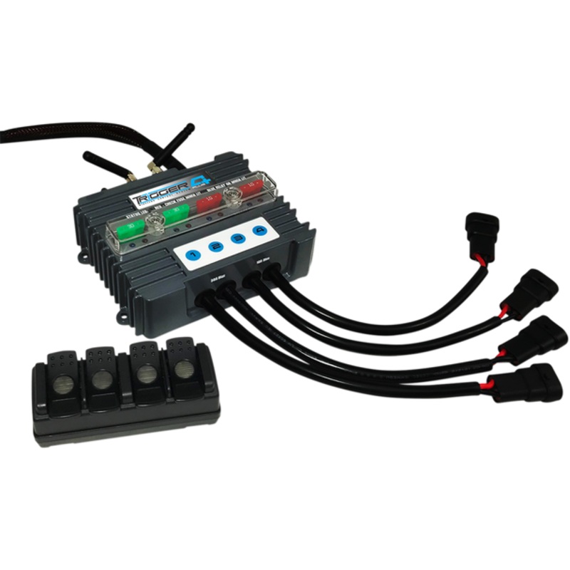 Control box:, 4 channels, 2 x 30 amp circuits, 2 x 10 amp circuits, All Solid State, 12-24 volt, battery powered RF Remote with universal mount system, Bluetooth control from phone/tablet app, Manual buttons for on/off on top of case, 12 to 24 volt out with waterproof connectors, Fuses built in, waterproof cover (30 amp – 1 and 2, 10 amp – 3 and 4), LEDs to indicate relay on and if fuse is blown, blue for circuit on, red for blown fuse, Waterproof case design, withstands temps to 250 deg. F and -20 deg. F below freezing, RF Remote:, 2.4 ghz frequency hopping RF connection to control box, Replaceable battery power, Back lit with the press of a button, App Control:, Apps for both Android and iOS with simple interface for turning on and off the 4 channels, Harnesses:, Kit includes wire harnesses with the mating connector to the control box on one end and blank wires on the other; Two 10 gauge, two 12 gauge