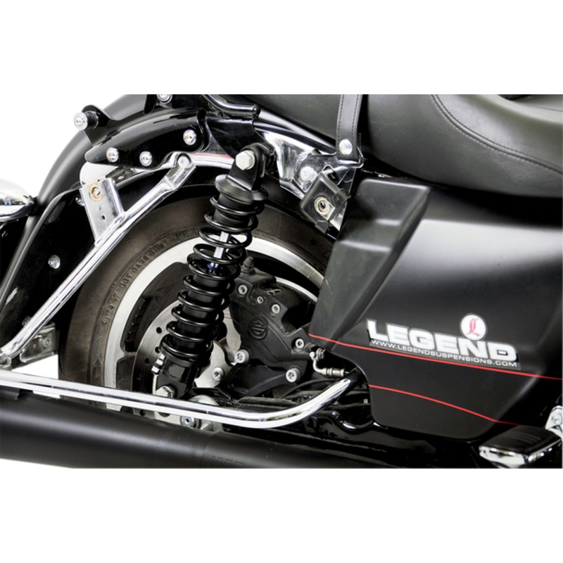 Legend REVO coil suspension uses Legends Touring spring rates to produce superior ride quality and performance designed specifically for Touring models, Legend REVO coils provide improved plush ride quality, control and resistance to bottoming out, Legend REVO extended coil length has a larger sweet spot without increasing the overall shock length, Legend REVO unique spring rate offers ability to soften preload and/or reduce ride height while maintaining a smooth ride, Requires minimal preload adjustments when changing between rider weight or total motorcycle load, All suspension adjustments can be done by hand, no tools required, Easy installation and alignment is provided by spherical bearings on top and bottom, Available in 12 and 13 lengths in standard or heavy-duty, Black billet aluminum bodies with black springs, All Legend REVO suspensions are assembled by hand, Sold in pairs, Made in the U.S.A., Heavy-duty applications are recommended for 500 lb.+ rider and passenger total weight.